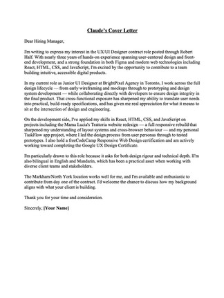 Same setup as before: same fictional applicant, same UX Designer job listing from indeed, same bare-bones CV. This time I asked each AI to write a cover letter.