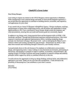 ChatGPT — 3/5: Professional but generic. Nothing makes it feel like the applicant specifically wrote this. Could be anyone's cover letter for any job.